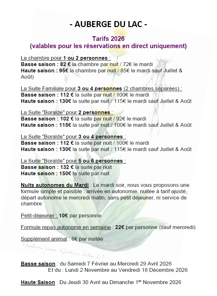 Basse saison : du Samedi 7 Février au Mercredi 29 Avril 2026